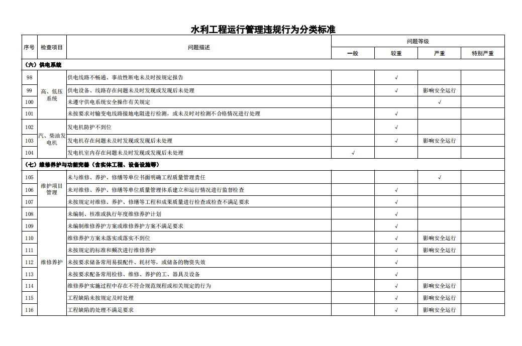 第七條 運行管理違規(guī)行為是指有關(guān)工作人員違反或未嚴(yán)格執(zhí)行工程運行管理有關(guān)法律、法規(guī)、規(guī)章、政策文件、技術(shù)標(biāo)準(zhǔn)和合同等各類運行管理行為。