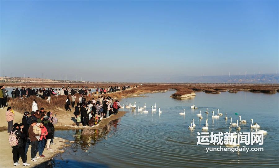 游客們七嘴八舌,顯得十分開心。經(jīng)過十幾分鐘的行駛,小火車便到達(dá)了天鵝棲息地。在那里,成群結(jié)隊(duì)的天鵝在水中或玩耍嬉戲,或展翅飛翔,或低頭覓食,為鹽湖帶來了勃勃生機(jī),惹得游客驚嘆連連,不斷拿起手機(jī)記錄拍照,一幅人與自然和諧相處的畫面。